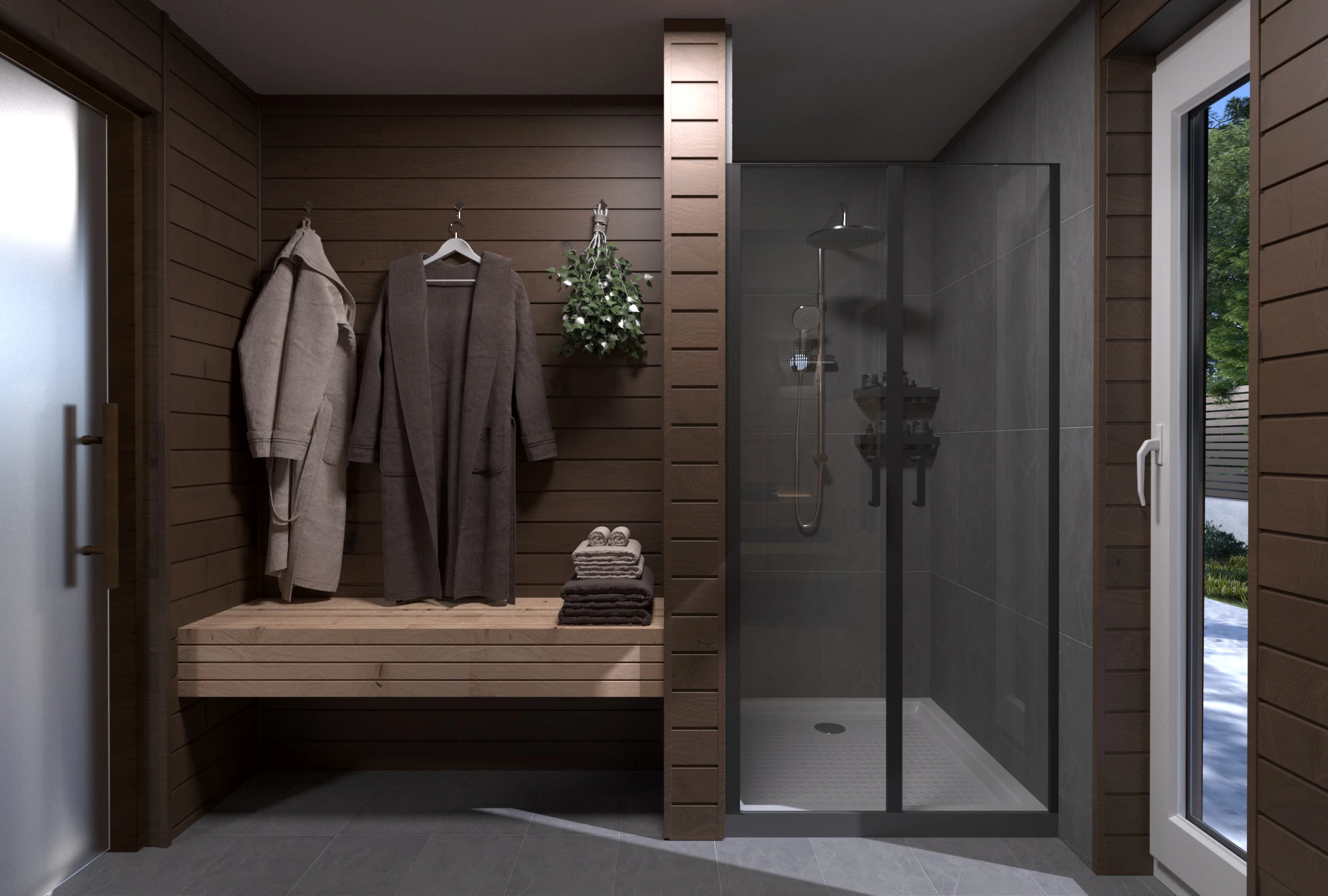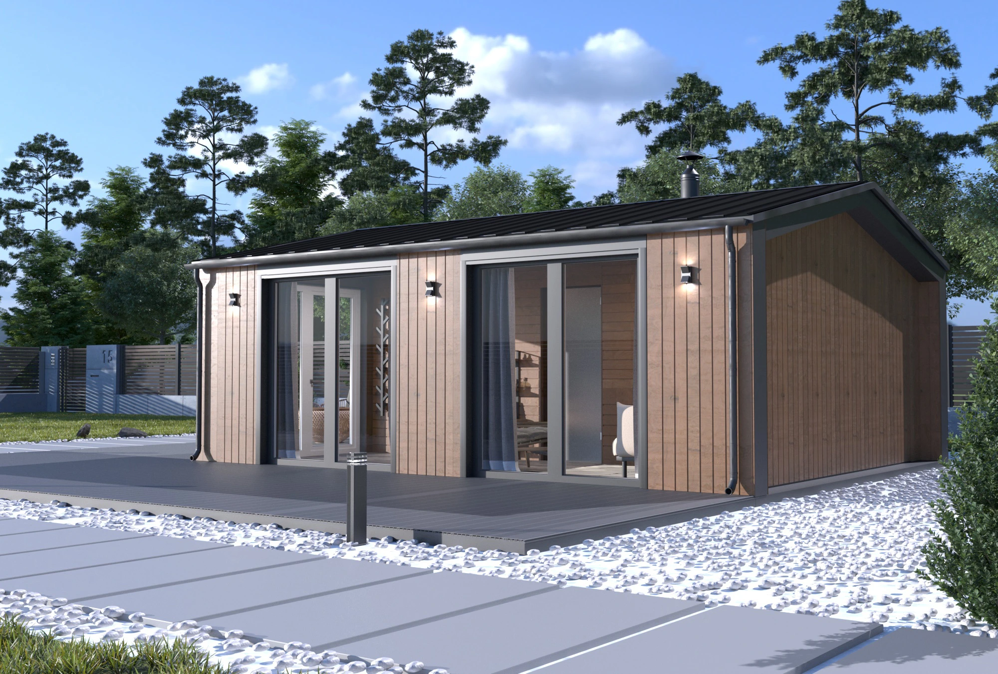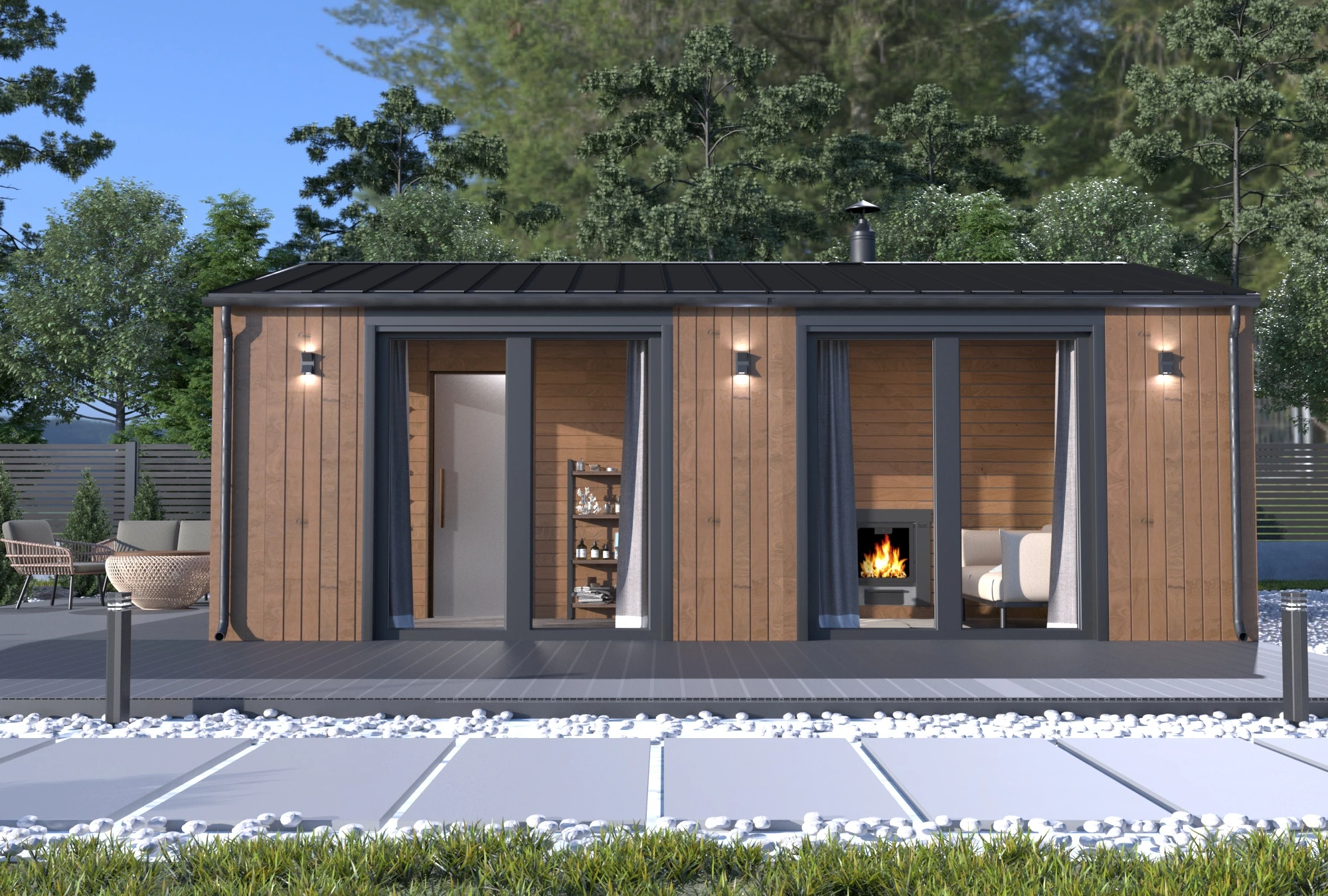 Панорамные окна наполняют интерьер естественным светом, создают ощущение расширенного пространства и открывают вид на участок. Чёткая геометрия, сочетание дерева и тёмных акцентов подчёркивают характер модели. Баня органично вписывается на любом участке и становится его стильным элементом.