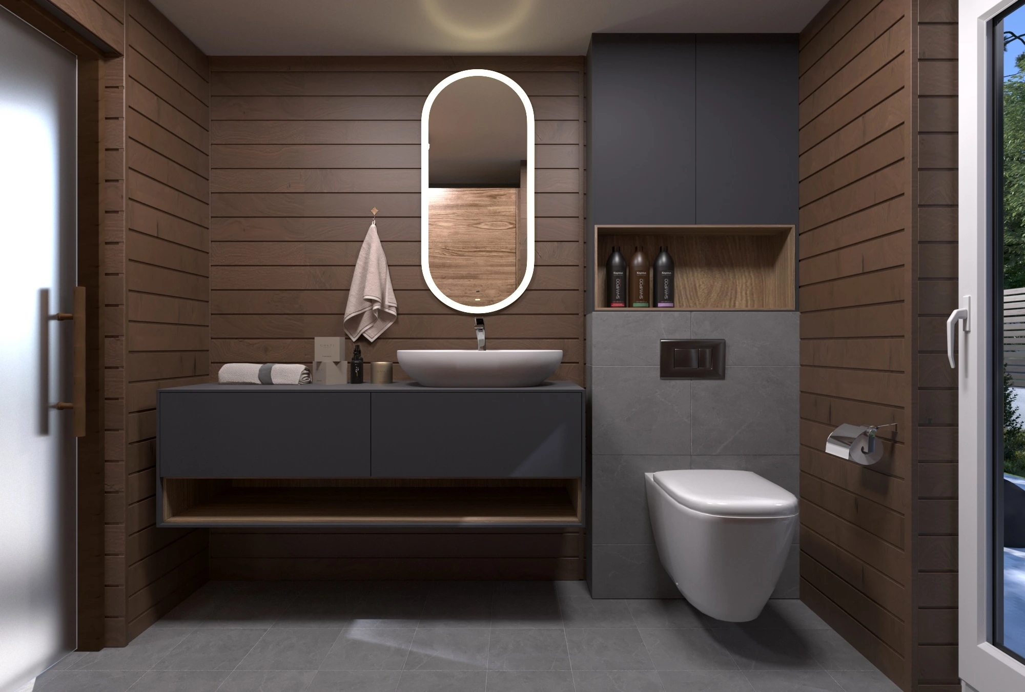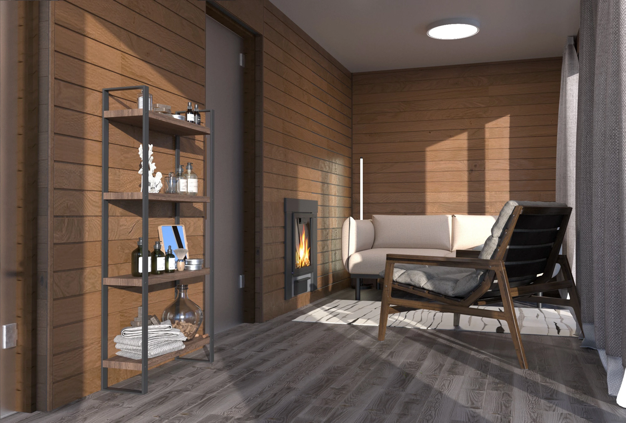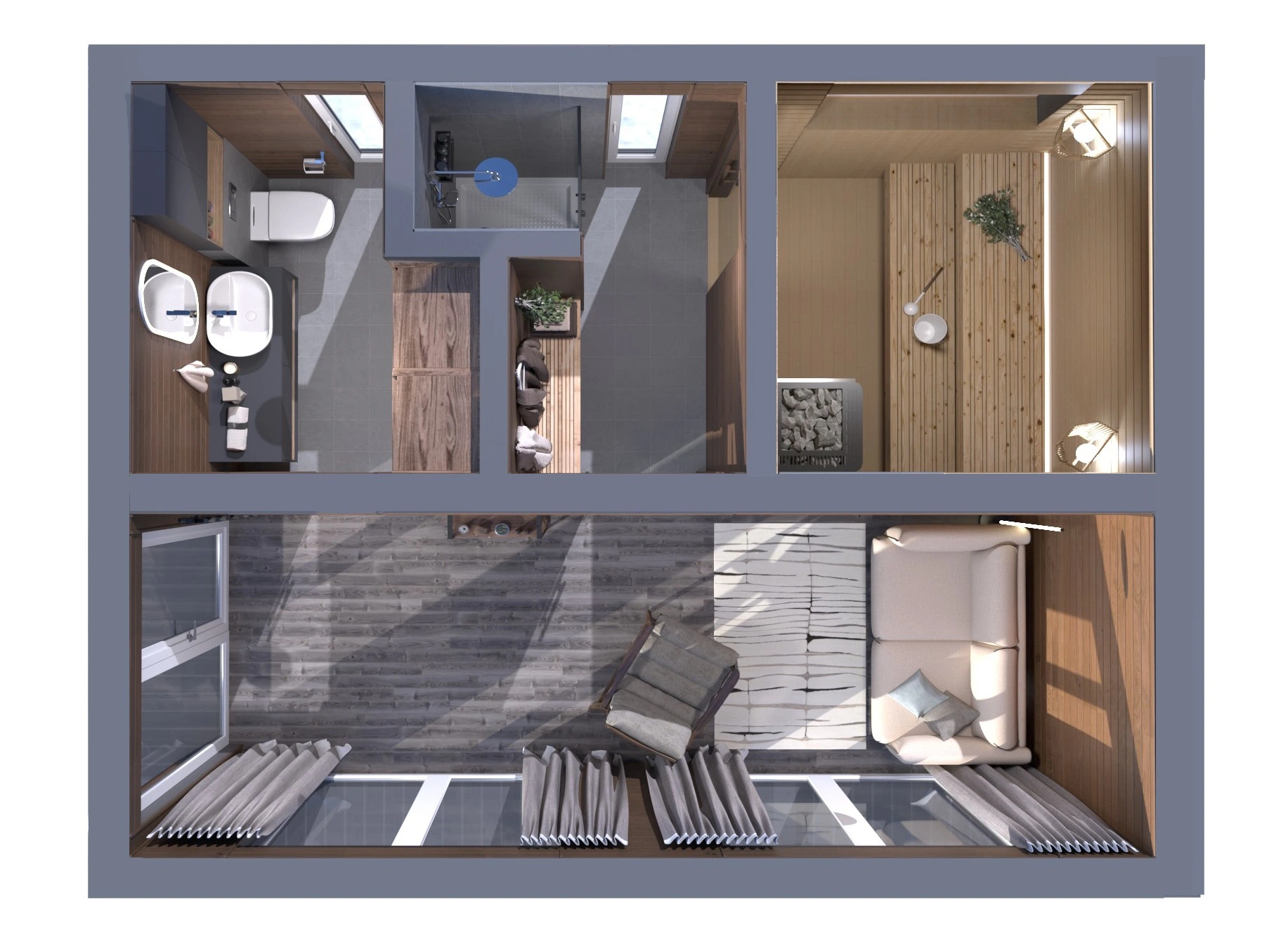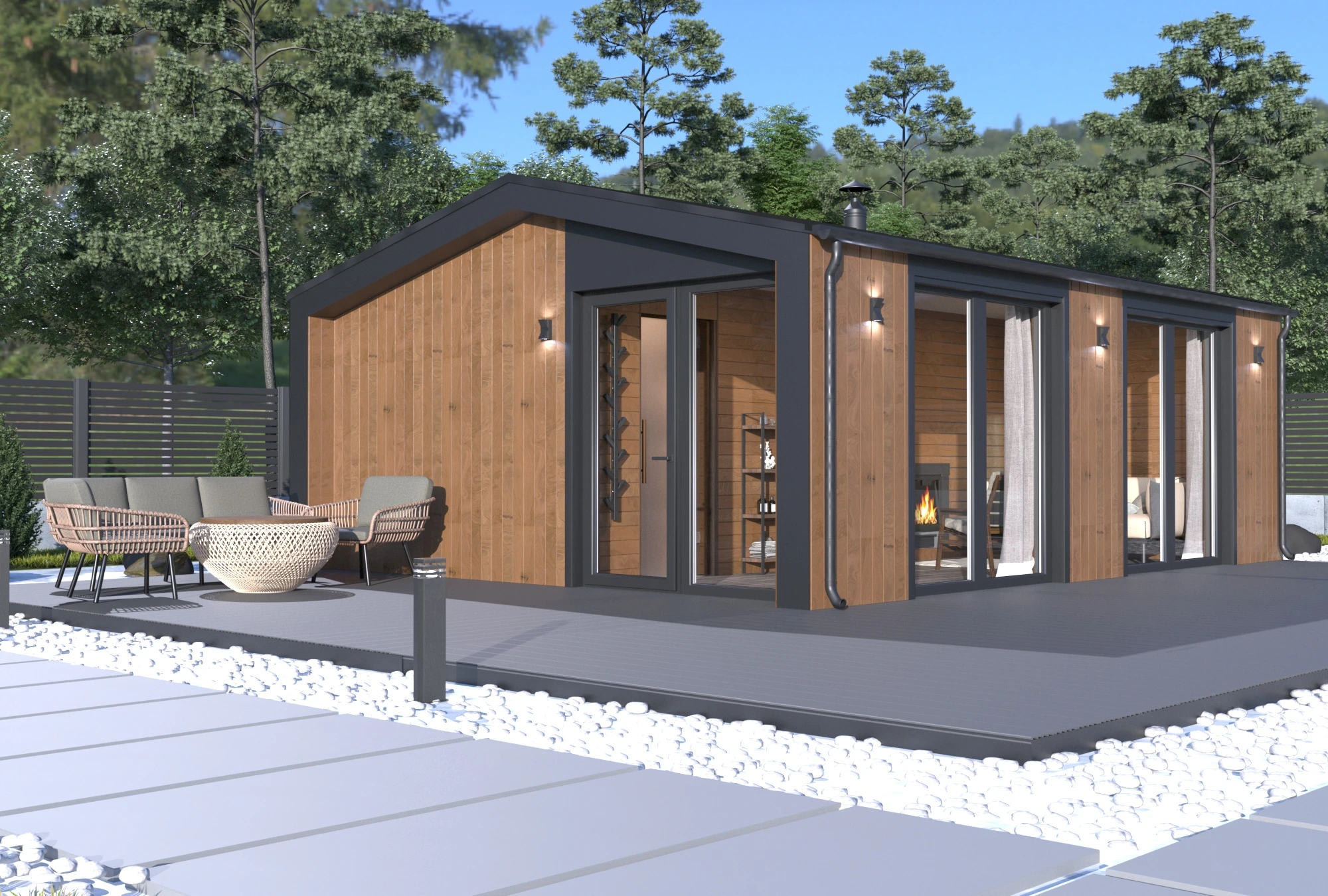 Панорамные окна наполняют интерьер естественным светом, создают ощущение расширенного пространства и открывают вид на участок. Чёткая геометрия, сочетание дерева и тёмных акцентов подчёркивают характер модели. Баня органично вписывается на любом участке и становится его стильным элементом.