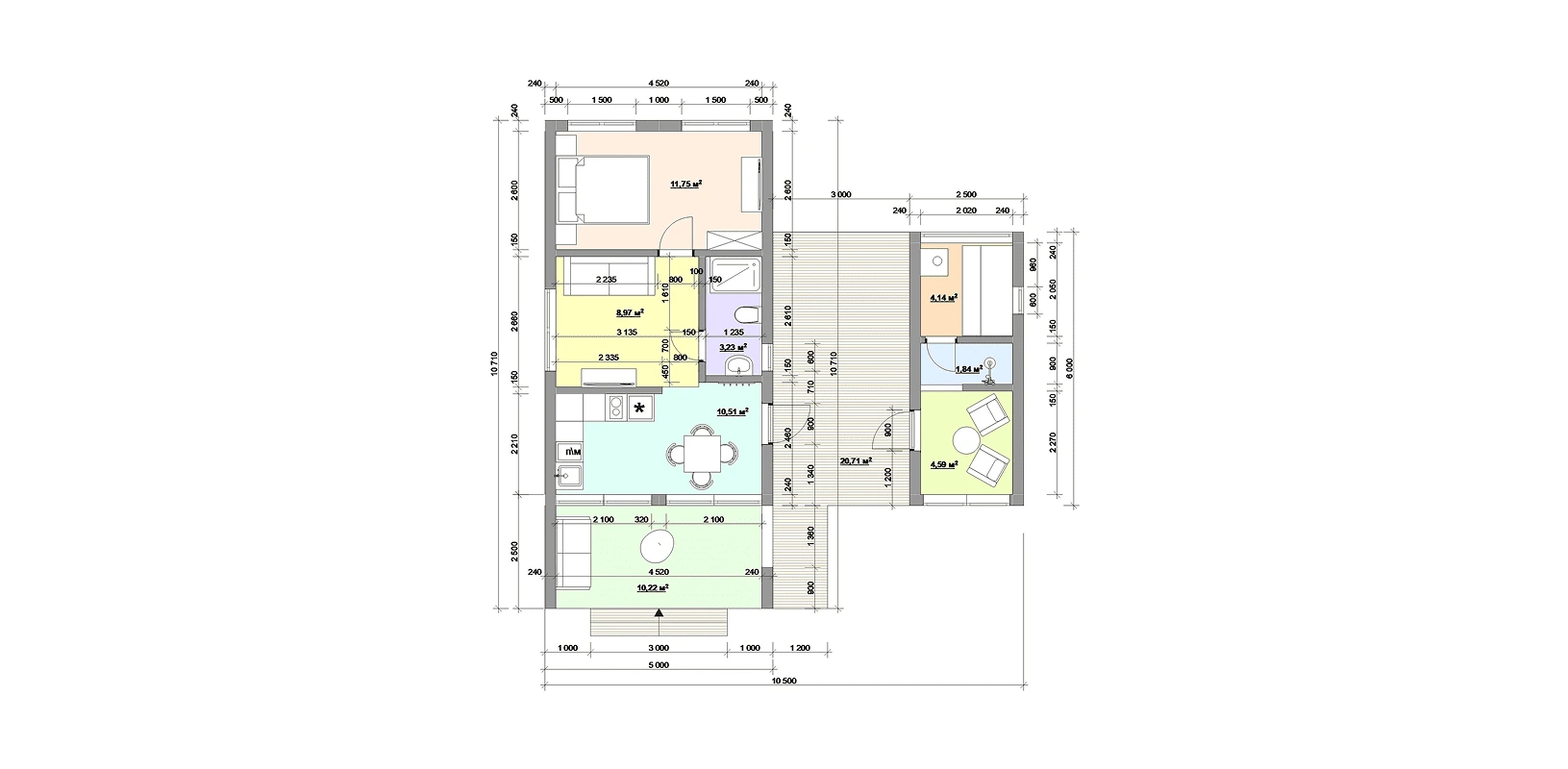 Шестимодульный комплекс включает дом с открытой верандой, современную баню и общую террасу. В доме расположена просторная спальня с двумя окнами, кухня, гостиная с панорамными окнами.