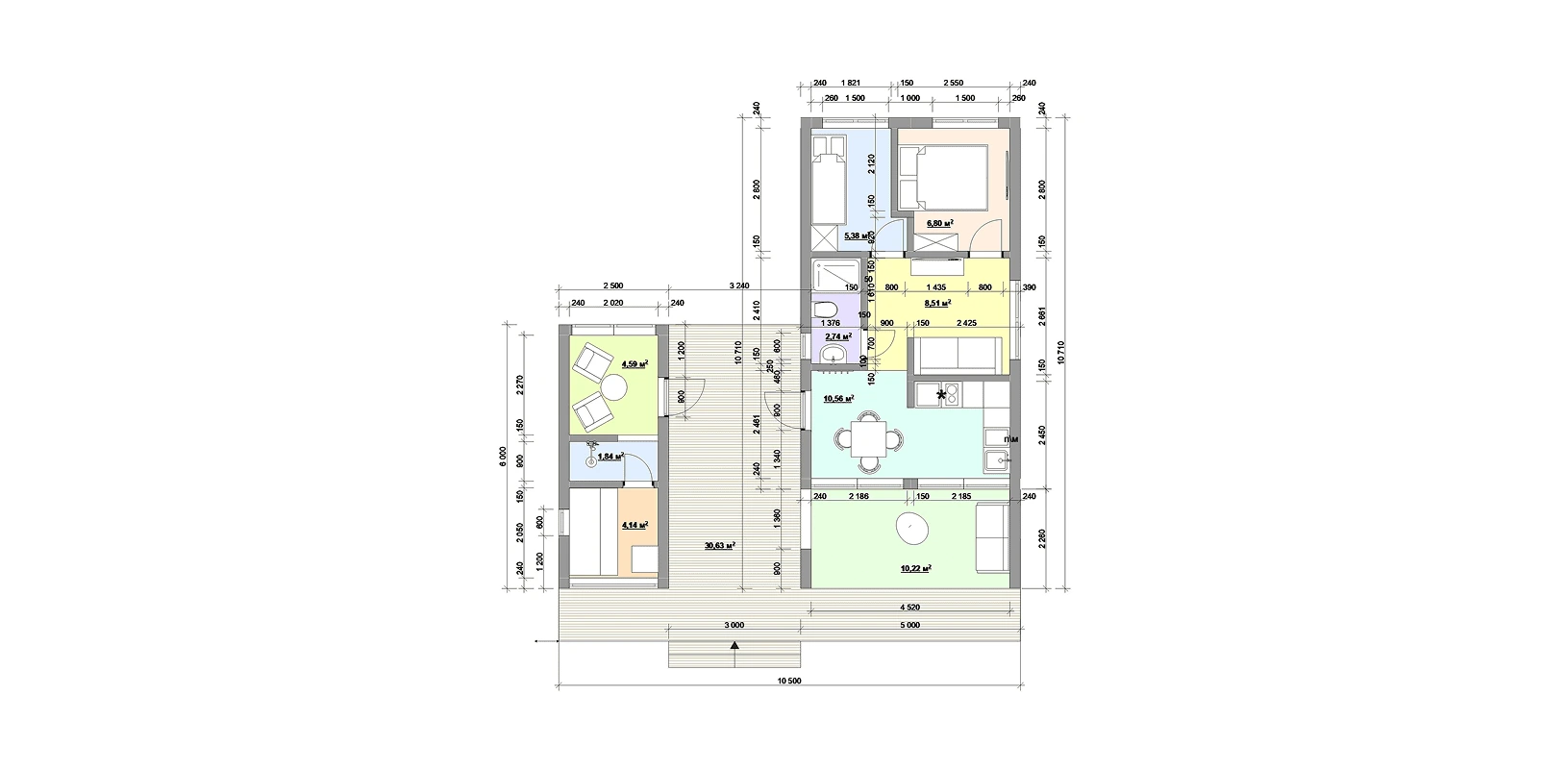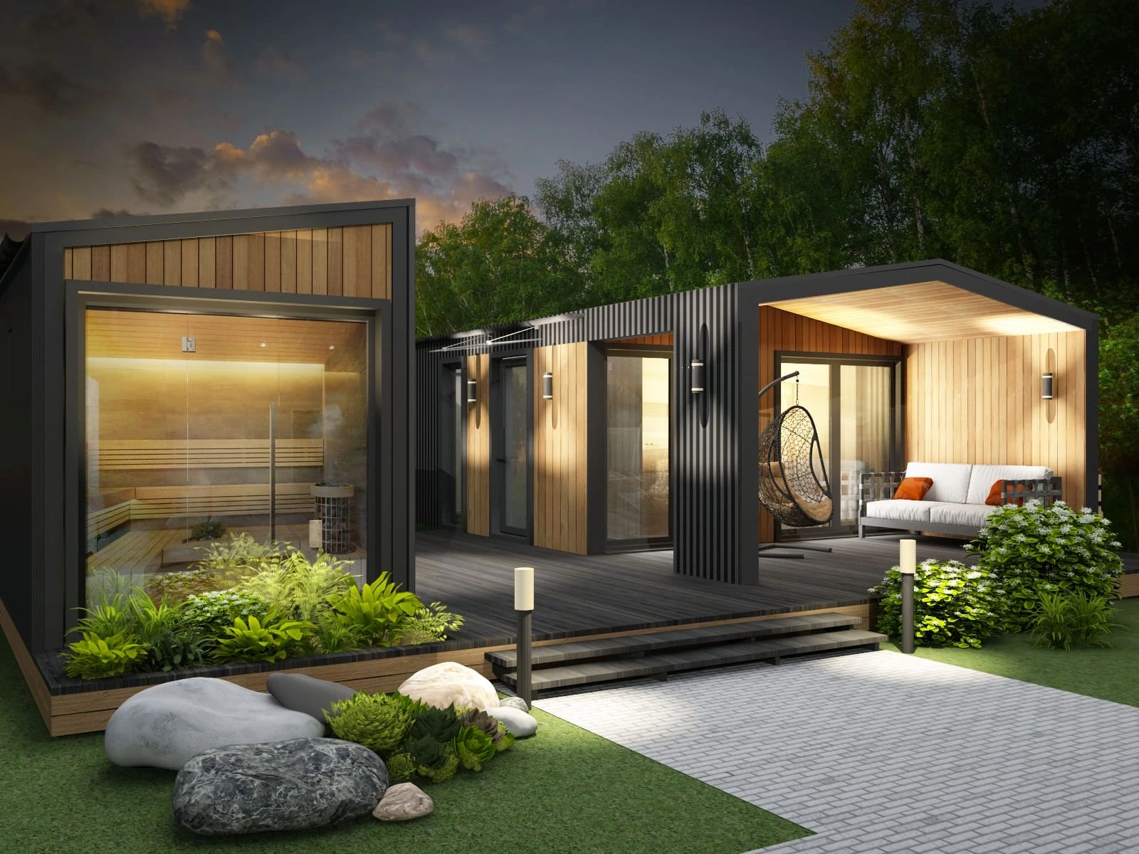 Шестимодульный комплекс, в котором гармонично сочетаются жилой дом с уютной верандой, современная баня и просторная общая терраса. В доме реализована эргономичная планировка: две изолированные спальни, функциональная кухня и просторная гостиная. Особую привлекательность помещению придают панорамные окна, через которые проникает много естественного света. Веранда, выполненная в открытом формате, прекрасно подходит для отдыха на свежем воздухе в любое время суток.