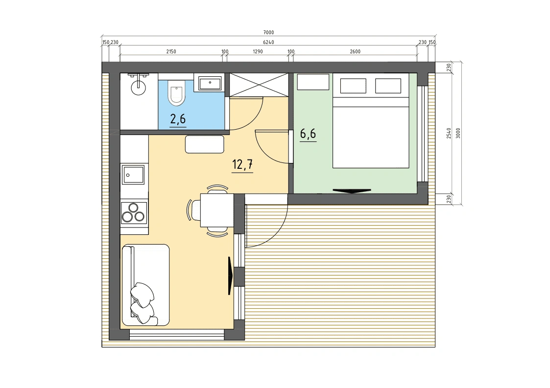 Арайя Макс — просторный дом с выразительной архитектурой и продуманной планировкой. Внутри предусмотрена большая жилая зона с кухней и местом для отдыха, отдельная спальня и санузел, что делает дом удобным для постоянного проживания или загородного использования.