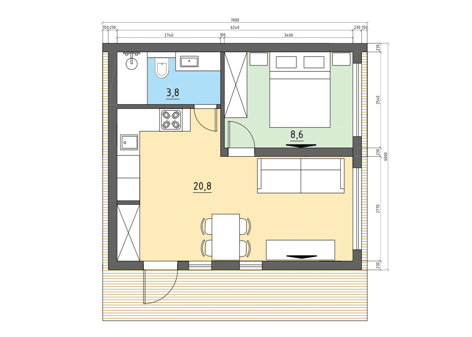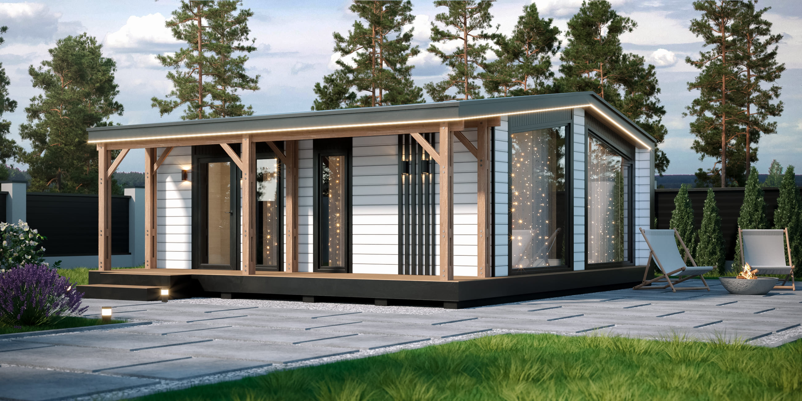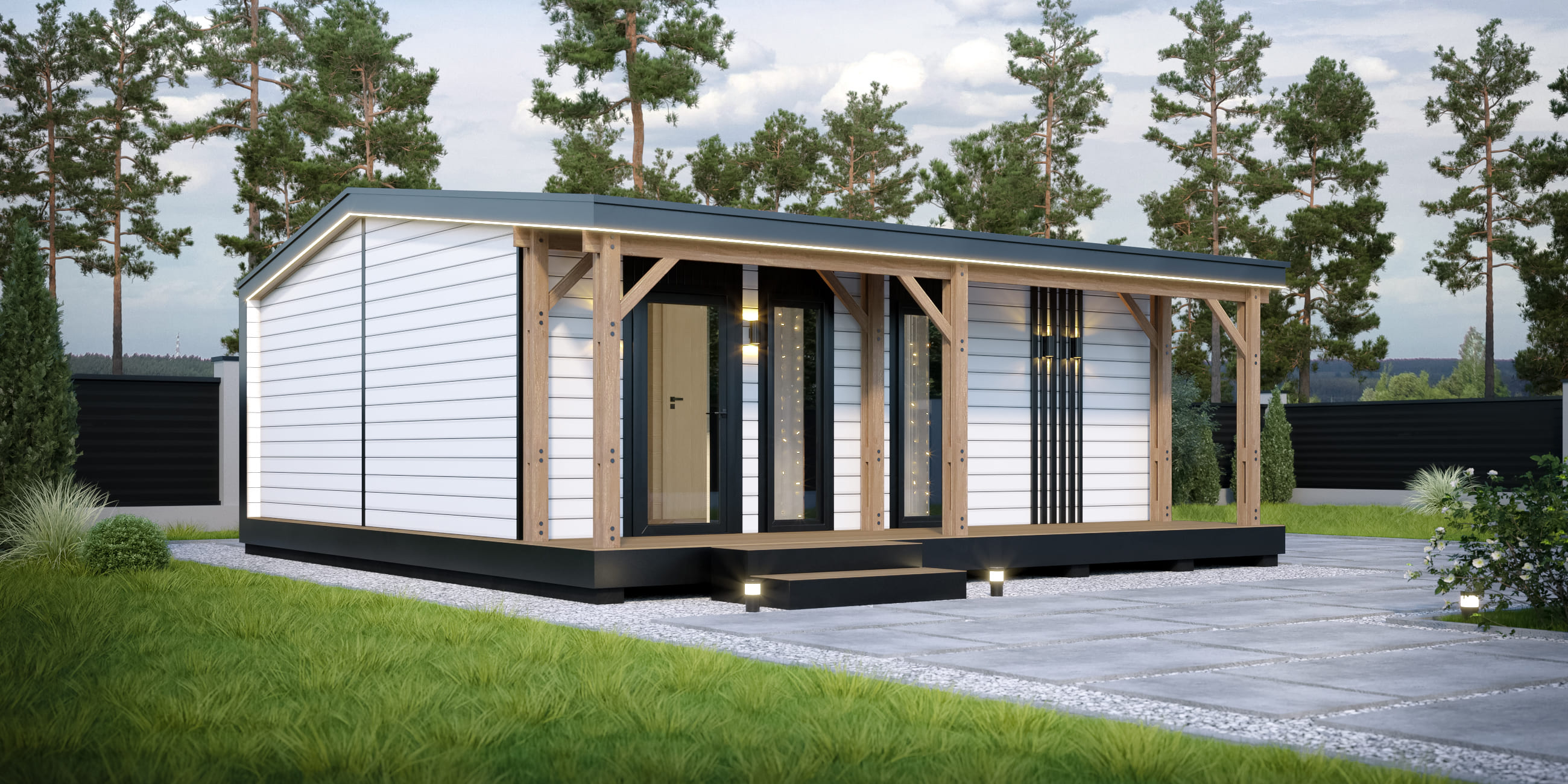 Арайя Про — современный дом с выразительной геометрией и акцентом на свет и пространство. Планировка включает просторную кухню-гостиную, изолированную спальню и санузел, что делает дом удобным для проживания и отдыха.