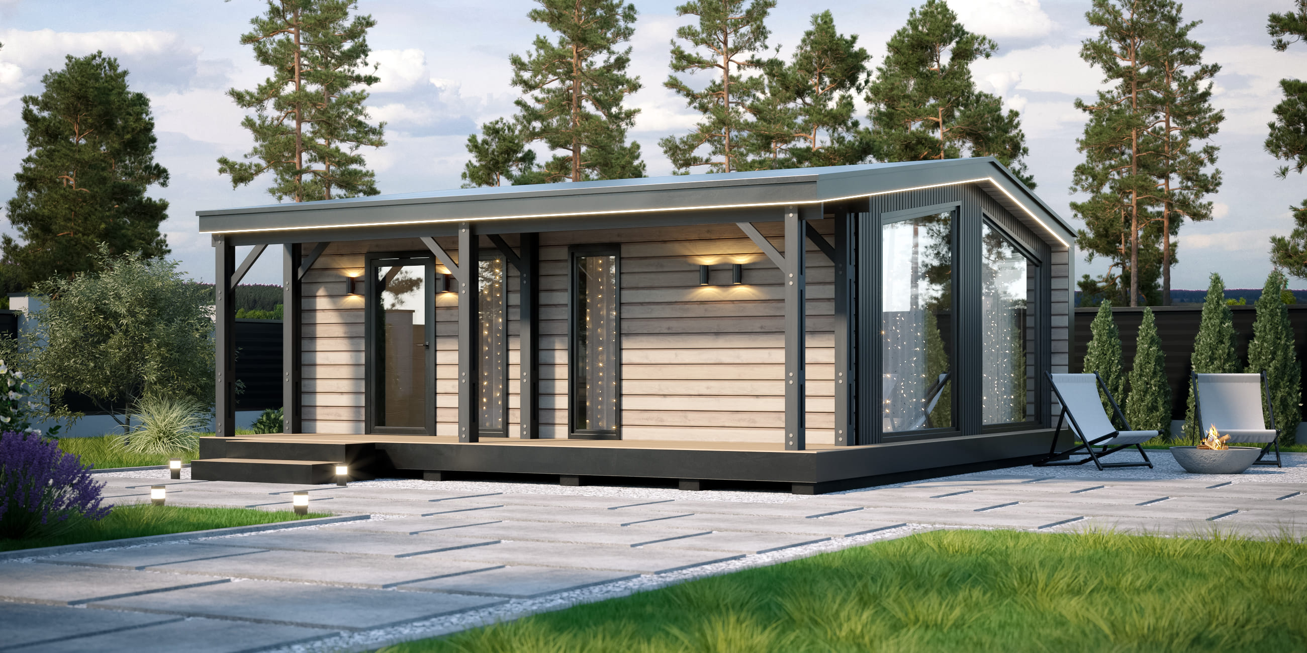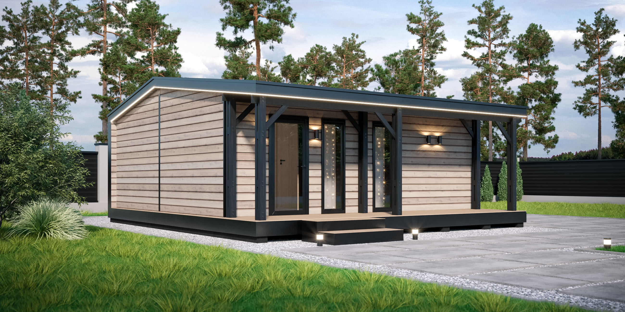 Дом Арайя Про 2 — современный одноэтажный дом с продуманной планировкой для комфортной жизни за городом. Внутри выделены просторная кухня-гостиная, отдельная спальня и санузел.