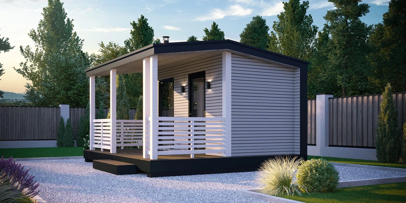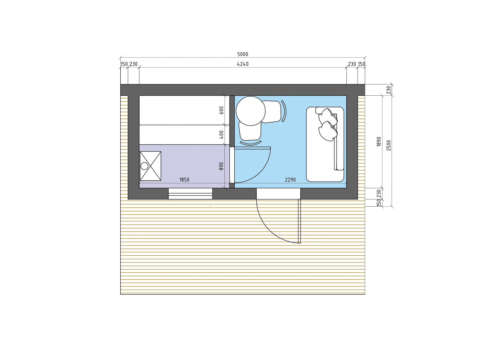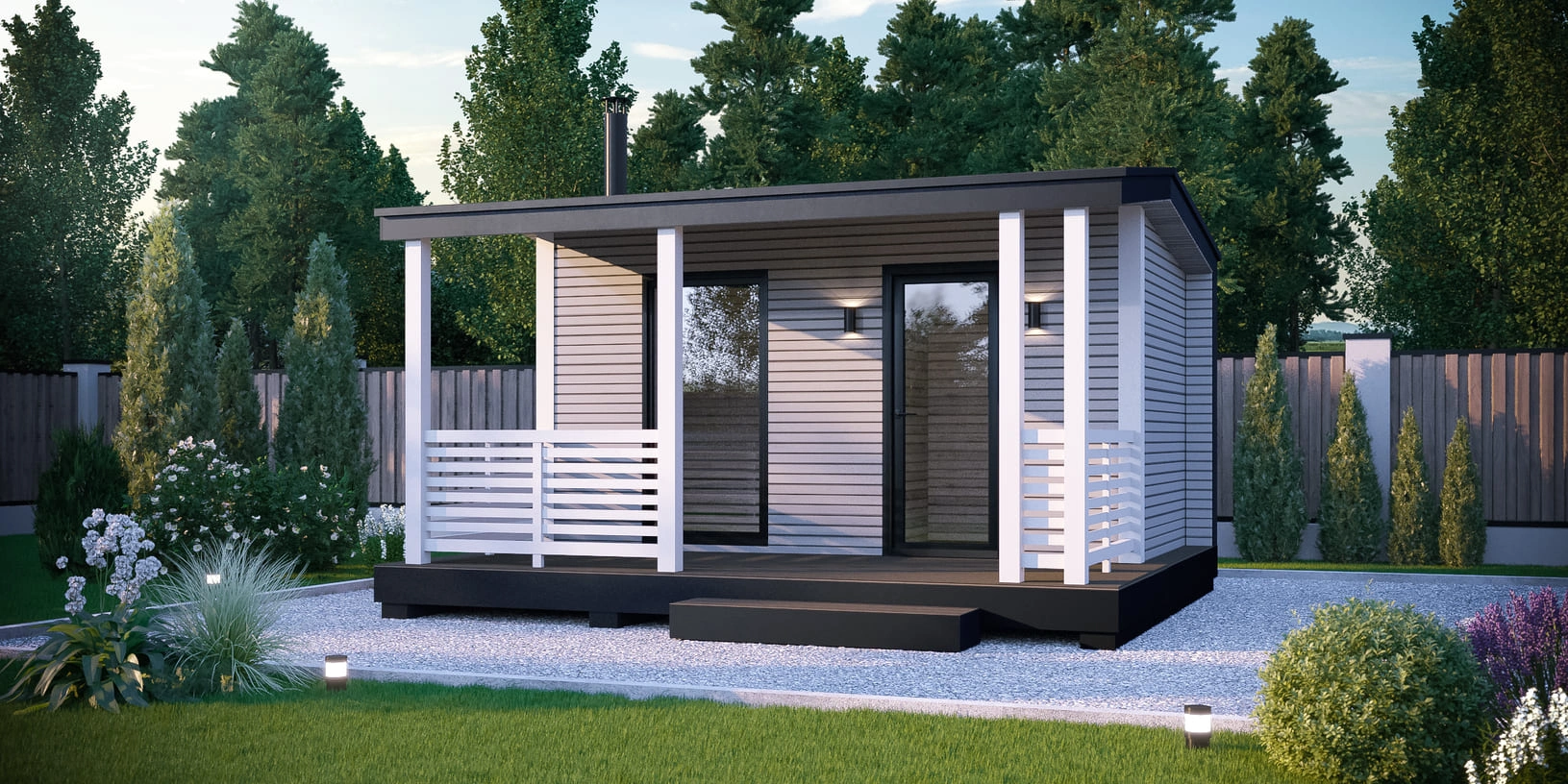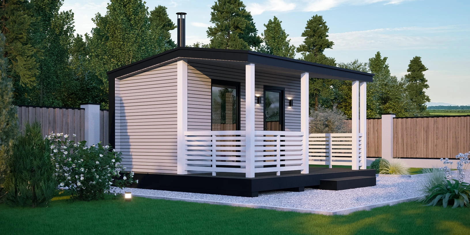 Панорамные окна и дверь наполняют интерьер светом, создают ощущение расширенного пространства и позволяют видеть участок изнутри. Внутри расположены парная и зона отдыха — всё необходимое для комфортного отдыха после парной. Модель рассчитана на 1–3 человек и гармонично вписывается на любом участке.