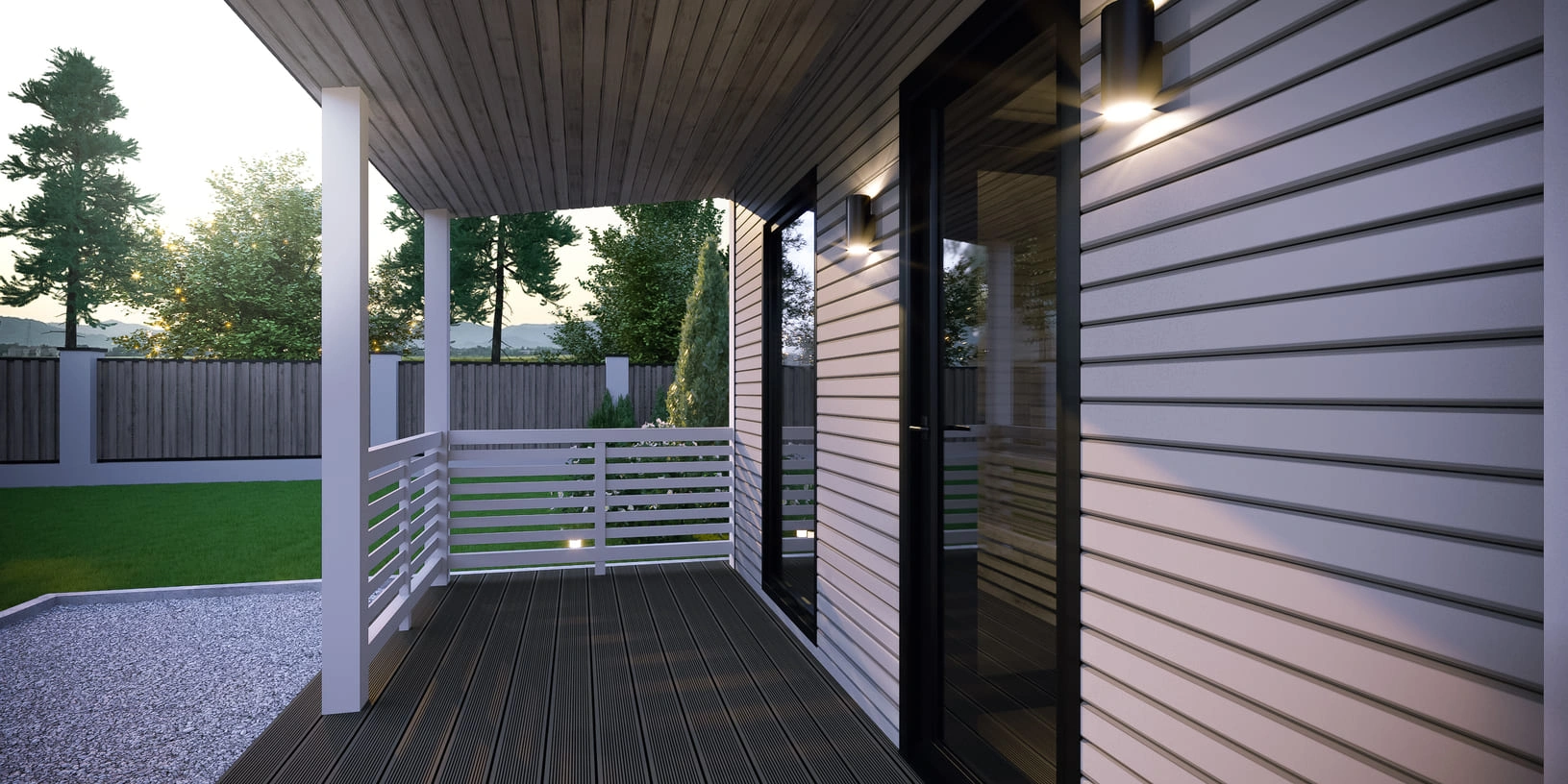 Баня «Джови Лайт 3» имеет светлый современный фасад и уютную веранду, на которой приятно проводить время на свежем воздухе.