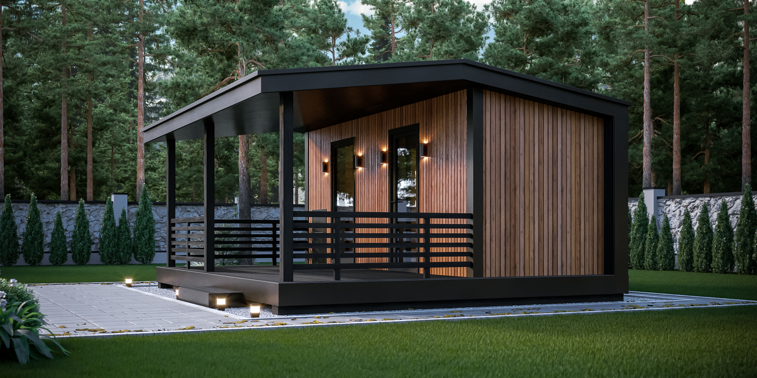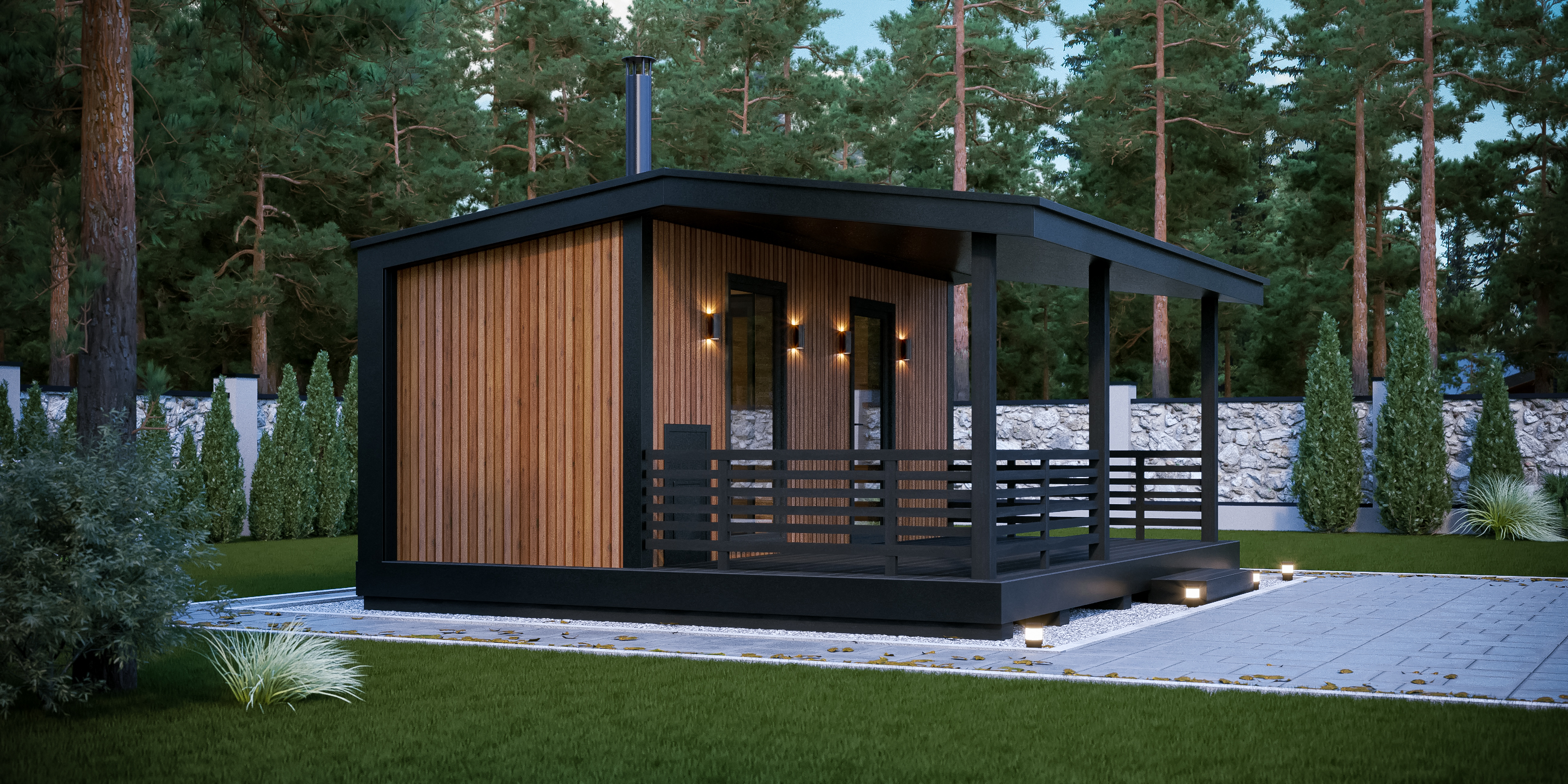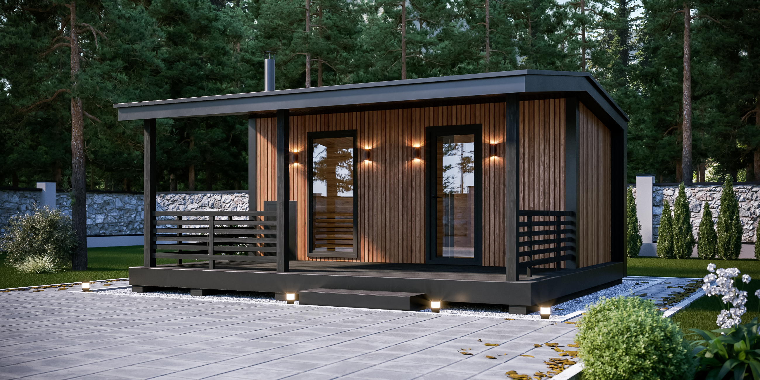 Натуральное дерево фасада подчёркнуто тёмными линиями, а просторная веранда задаёт приятную зону для отдыха на воздухе. Панорамные окна наполняют помещения светом, создают ощущение расширенного пространства и открывают вид на участок. Внутри есть парная, душевая и зона отдыха для расслабления после парной. Модель рассчитана на 1–3 человек и органично вписывается на любом участке.