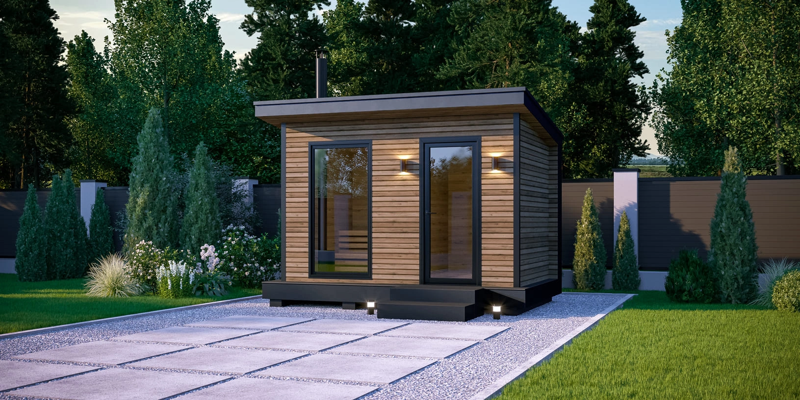 Баня «Джови мини 2» выполнена в современном стиле с фасадом из натурального дерева и чистой геометрией линий.