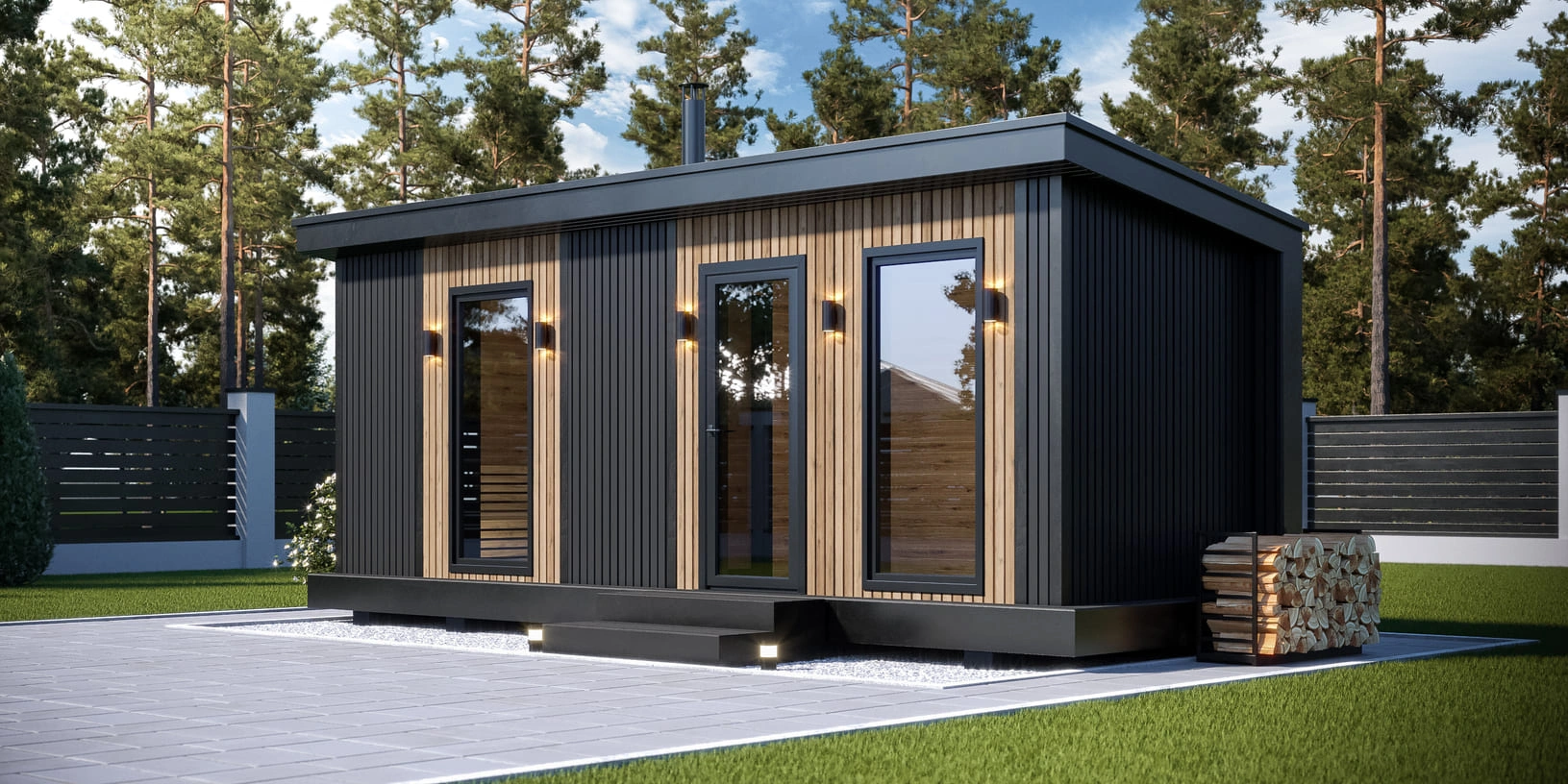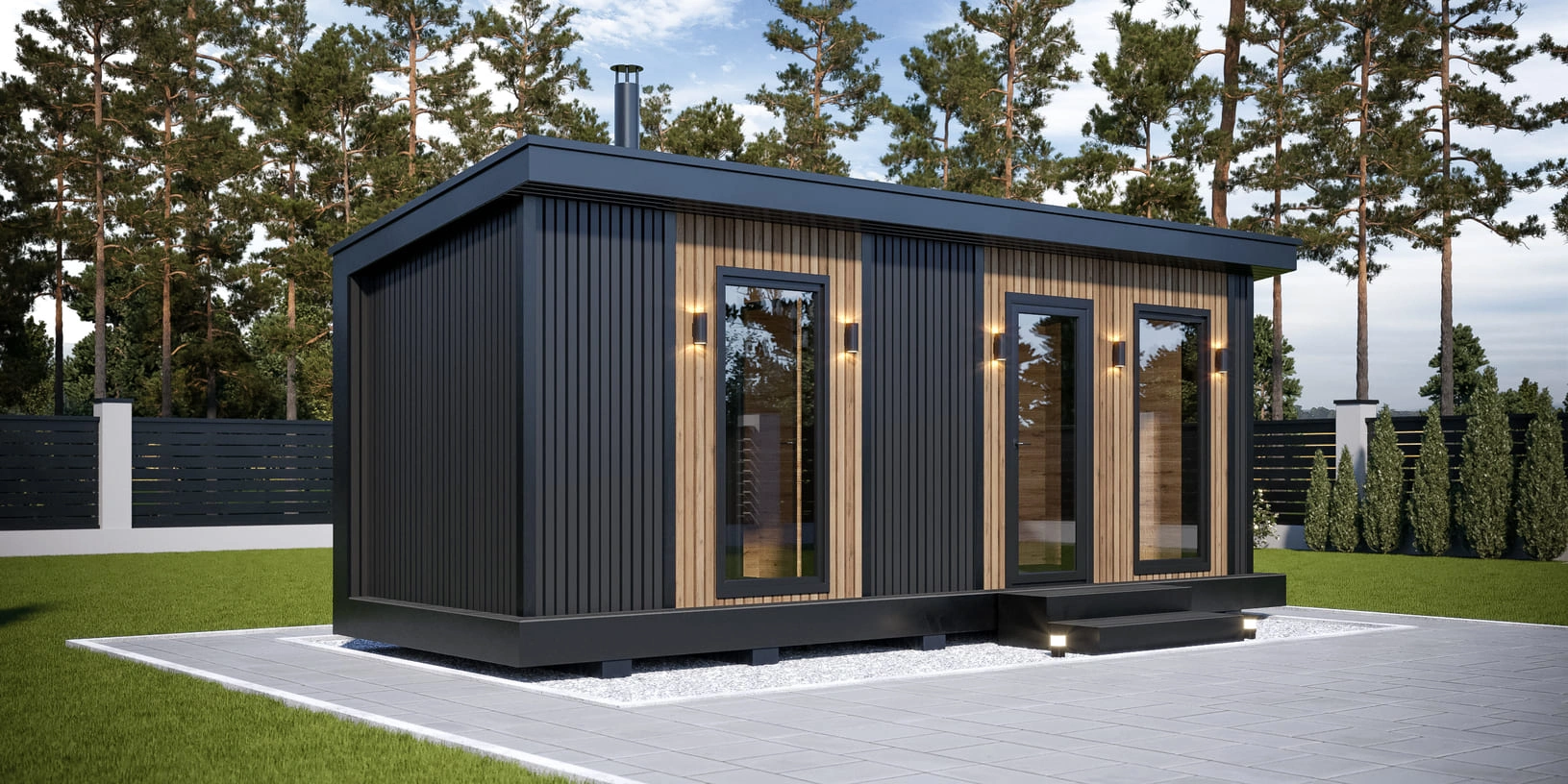 Внутри расположены парная, душевая и просторная комната отдыха с местом для расслабления. Панорамные окна визуально расширяют пространство и наполняют интерьер светом, открывая приятный вид на участок. Современная архитектура и сочетание дерева с тёмными акцентами делают баню стильным элементом ландшафта. Органично вписывается на любом участке.